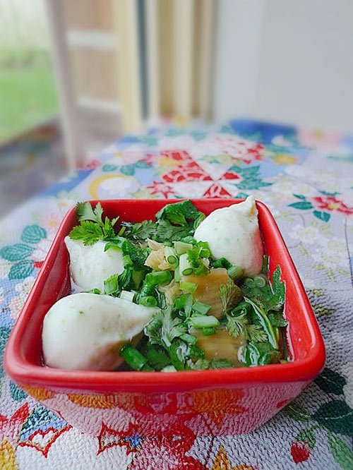 7、就像煮即食汤丸一样,鱼包蛋浮上来大概也快熟了的时候将荠菜加入。