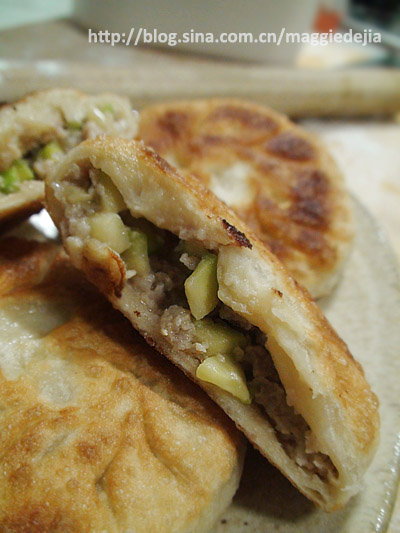 及以下步骤:包入馅料,像包包子一样包好,压扁。 平底锅放少许油,中火,放入饼,可以盖上盖子焖一下,内陷容易熟,两面煎成金黄色,即可出锅。 面粉加水,用筷子和成面团,用手揉匀,静置20分钟左右。 肉末加少许盐,一点点五香粉,一大勺生抽,顺一个方向搅拌上浆。 西葫芦切丁,加少许盐,静置一会等出水后,挤掉水分,加入肉中。 再加点香油和用葱姜熬香的玉米油,干的话可以适当调一点点水或鸡蛋。 醒好的面团搓成长条切成小段。 取一小段擀成中间厚两边薄的饼状。 包入馅料,像包包子一样包好,压扁。 平底锅放少许油,中火,放入饼,可以盖上盖子焖一下,内陷容易熟,两面煎成金黄色,即可出锅。