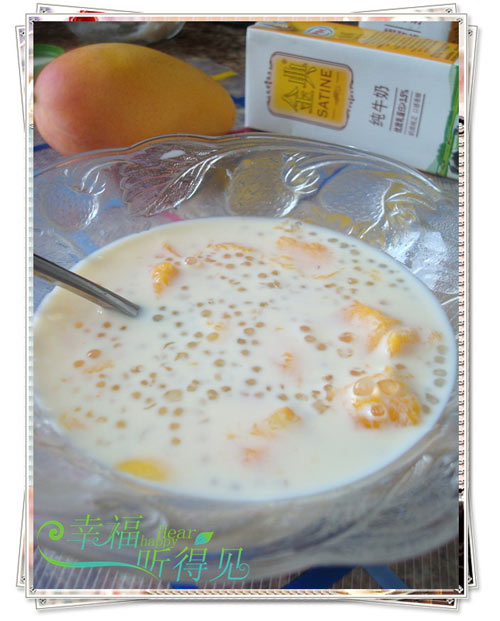 及以下步骤:放入芒果果肉。 倒入冰牛奶。 加入蜂蜜搅拌均匀就可以吃了。 放入西米,开大火煮,西米在水中翻滚不会粘锅,大约煮15分钟左右。 煮到西米只剩下一点点白芯的时候关火,盖上盖子焖一会。 等西米完全变成透明了就捞起过凉水,这样西米的口感qq的很好吃。 西米放入小碗中。 放入芒果果肉。 倒入冰牛奶。 加入蜂蜜搅拌均匀就可以吃了。