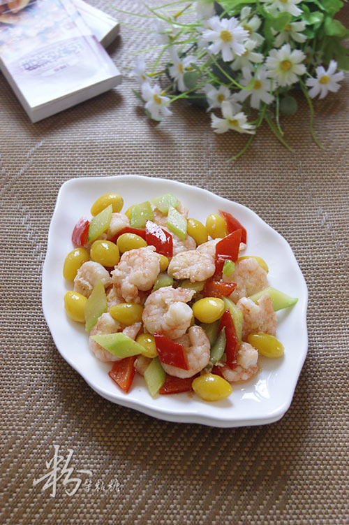 及以下步骤:然后放入黄瓜片、红椒片和高汤,撒入1/2茶匙盐和鸡精,翻炒均匀。 再放入白果、虾仁翻炒,淋1汤匙明油出锅。 主料备好。 白果去壳,把白果放到热水里浸片刻,撕衣,取出绿色胚芯。 虾仁去头去壳去虾肠,洗净后放入碗中,加入料酒、1/2茶匙盐、1/2茶匙鸡精抓匀,再加蛋清、水淀粉上浆腌渍半小时,白果洗净待用。 黄瓜去皮、红椒去籽切成菱形,葱白、姜切成末待用。 炒锅下3汤匙花生油烧热,放入虾仁、白果,虾仁颜色,虾身卷曲时划出。 另锅下2汤匙花生油烧热,放葱姜末炒出香味。 然后放入黄瓜片、红椒片和高汤,撒入1/2茶匙盐和鸡精,翻炒均匀。 再放入白果、虾仁翻炒,淋1汤匙明油出锅。