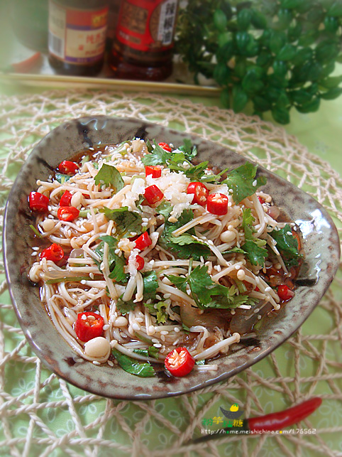7、金针菇、海蜇丝放入碗中,把蒜茸、辣椒粒、香菜段、熟芝麻及调料放入拌匀即可。