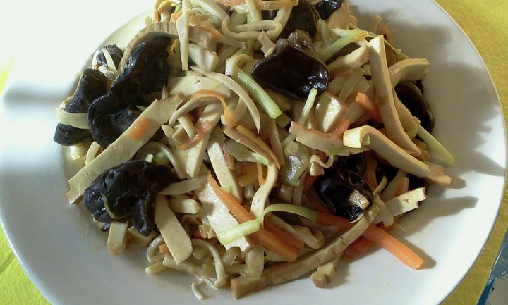 這也是江南家常菜, 全為素菜, 菜的鮮味主要來自菇菌, 還有材料的原味, 榨菜的爽口和咸味, 韭菜的香味. 此菜很清淡, 很适合飲食習慣較健康的人群. 也是一些三高和糖尿病, 腎病長期患者的理想佳餚.