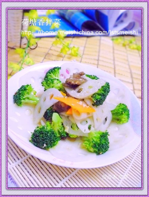 及以下步骤:然后把过 凉的食材捞出控干多余水分,放入香辣油、盐、糖、白醋、香油、味精等。 搅拌均匀装盘即可食用。 荷塘香拌菜食材。 把莲藕和胡萝卜切成片备用。 西兰花切成小朵清洗干净。 水发木耳清洗干净摘成小朵放入莲藕一起。 把以上食材放入开水中焯水。 焯水后的食材放入凉水中过凉备用。 然后把过 凉的食材捞出控干多余水分,放入香辣油、盐、糖、白醋、香油、味精等。 搅拌均匀装盘即可食用。