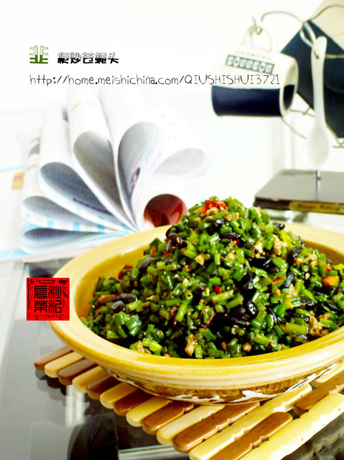 7、加入韭菜梗、蒸过的豆豉翻炒2分钟。