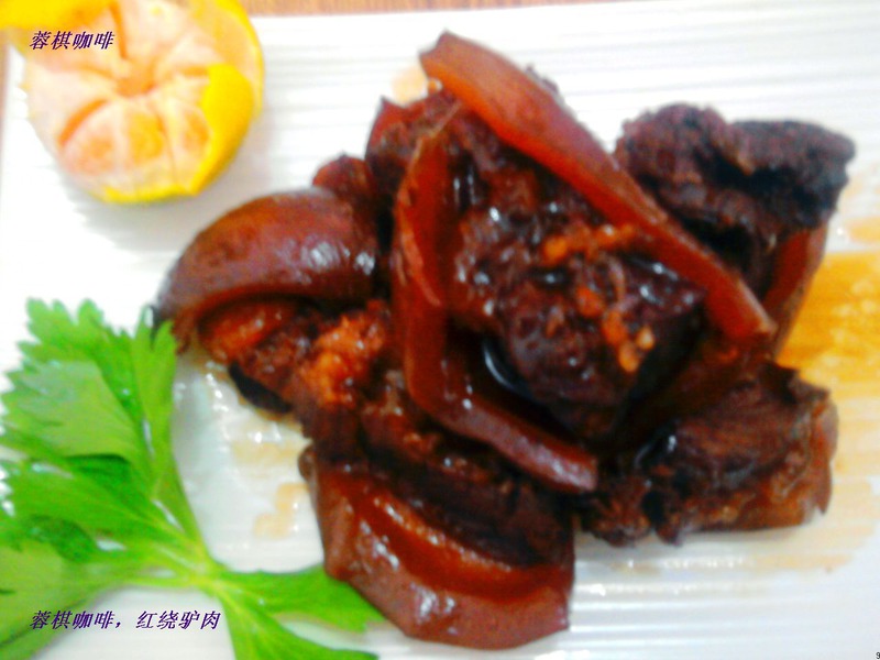 及以下步骤:红烧驴肉做好了。 把红烧驴肉切小块沾着汁吃,甜辣可口。 新鲜切好的驴肉。 配料:干辣椒5克,红枣子10克,桂皮一小块,八 锅里烧开水,驴肉在开水里掉一遍水捞取,放在 锅里麻油烧热,姜爆香,倒所有配料。 倒入驴肉爆炒,加盐,水晶糖,1/2瓶加饭酒焖2 改用砂锅煲30分钟。 红烧驴肉做好了。 把红烧驴肉切小块沾着汁吃,甜辣可口。