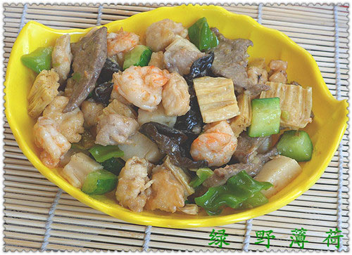 及以下步骤:上浆后的猪肝过油 上浆后的虾仁过油 盛盘中待用。 冬笋,青椒,黄瓜,腐竹切丁,葱姜蒜切末。木耳掰成小朵。 所有辅料下油锅煸炒后盛出。 葱姜蒜白胡椒粉炝锅, 下入鸡胸,猪肝,瘦猪肉,虾仁 烹入料酒煸炒一会儿。 放入冬笋,青椒,黄瓜,腐竹,木耳,盐,白糖。 淋少许水淀粉,关火后撒蒜末即可。