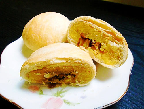 及以下步骤:准备面皮,中筋面粉过筛加入过筛糖粉,橄榄油揉搓至橄榄油被面粉吸附后,加入适量水揉成面团(不可先加水,再加油,一定要先加油再加水)静置50分钟。 准备油酥面,低筋面粉过筛加入橄榄油按压成均匀面团后放入冰箱冷藏一下,不要揉搓,以免起筋,千万不要加水。 将静置好的面皮和从雪柜中拿出的油酥面分别分割成每个15g的圆团。 面皮擀开包上油酥面。 将包好的面团擀成长薄片,一头小,一头大,从小的那个方向往大的那个方向卷起收口,光滑面朝下。 盖上保鲜膜,静置15分钟。 15分钟后,将长卷型的面卷按照本身的形状,用擀面杖擀成长薄片。 将擀好面仍然是光滑面朝下卷起,盖上保鲜膜静置25分钟。 静置完成的面团在中间按压一下,对折,然后收口擀成大小约为12cm左右的面皮,光滑面在外。 咸馅料,香菇腐皮绿豆。