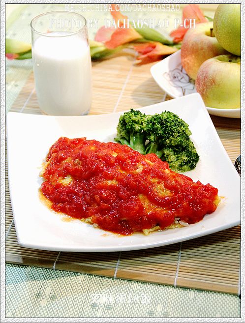 及以下步骤:把蛋饼上下折叠包好米饭,然后放入盘中,摆上事先汆烫好腌好味的西兰花作为配菜。 用锅中的底油煸炒番茄碎粒和番茄酱。 把酱炒至软烂后放入少许糖以降低中和一下酸味。 撒少许味精提鲜(不放也可以)。 撒入少许盐调咸淡味,炒匀后便可出锅。 把炒好的番茄酱料浇在鸡蛋表面便可食用。 把酱炒至软烂后放入少许糖以降低中和一下酸味。 撒少许味精提鲜(不放也可以)。 撒入少许盐调咸淡味,炒匀后便可出锅。 把炒好的番茄酱料浇在鸡蛋表面便可食用。