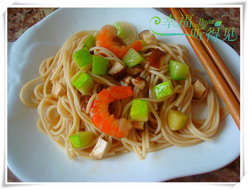 虾仁(适量) / 香菇(适量) / 黄瓜(适量) / 细面(适量) / 葱白(适量)
