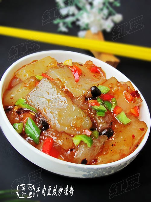普通的凉粉,只是加入一些牛肉豆豉,却可以变成一道香辣开胃的饭遭殃小菜。 色泽红亮诱人,口味咸,香,微辣,真的是很不错的一道下饭菜。