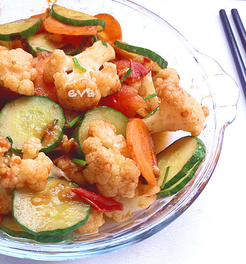 及以下步骤:准备好所需材料。 花菜掰成小朵,胡萝卜黄瓜切片,番茄切丁。 准备好所需材料。 花菜掰成小朵,胡萝卜黄瓜切片,番茄切丁。 准备好所需材料。 花菜掰成小朵,胡萝卜黄瓜切片,番茄切丁。 锅内倒入油烧热炒香蒜末。 下番茄,胡萝卜,菜花翻炒。 放少许盐,水淀粉勾芡。 最后放入黄瓜片,韭菜翻炒,加点儿鸡精出锅。