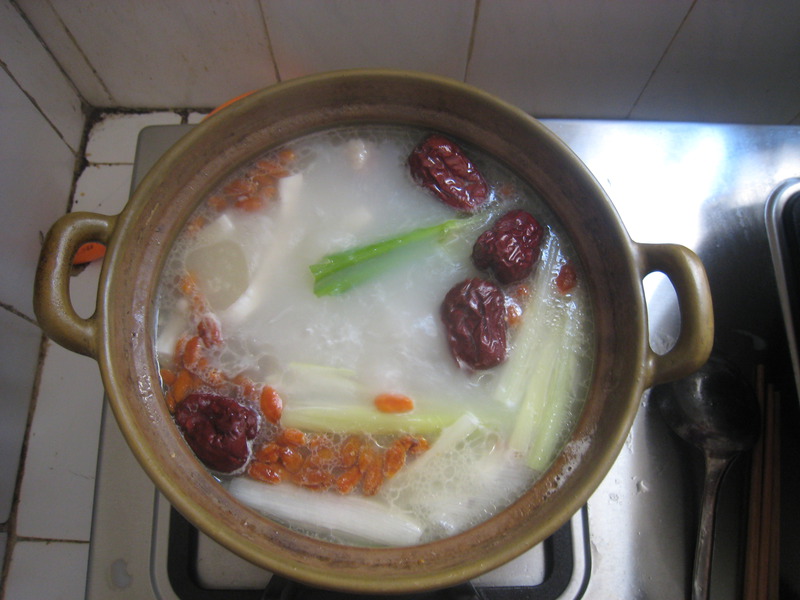 4、将压好的骨头汤与骨头再装到沙锅内煮沸加入椰汁、牛奶(适量)转小火约15分钟左右,然后依次红枣、大葱、枸杞(如果枸杞加太早会煮烂,汤就变得有点微黄的感觉),盐。煮沸即可上桌喝汤。
