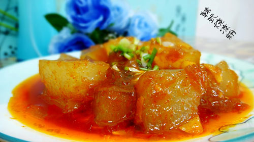 及以下步骤:大火烧开转小火烧约三分之一汤汁时,加入少许盐。 倒入金澜酱油调味即可 最后大火收汁,撒入葱花即可。 锅热注加入凉粉块小火煎至2分钟。 颜色稍微呈透明状时加入姜蒜末。 一勺韩式辣椒酱。 再加入半玩清水以没过凉粉块三分之二即可。 大火烧开转小火烧约三分之一汤汁时,加入少许盐。 倒入金澜酱油调味即可 最后大火收汁,撒入葱花即可。