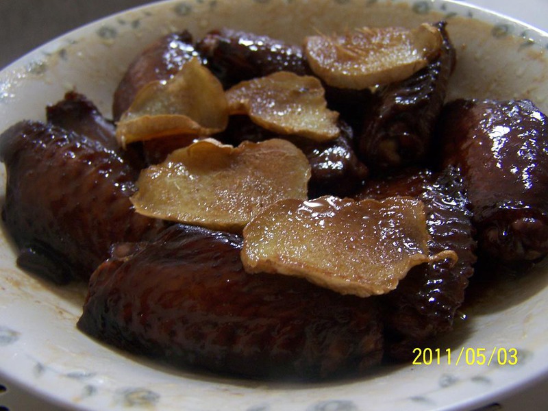 7、把鸡翅从腌料中捞出,刷上蜂蜜,盖上若干姜片。