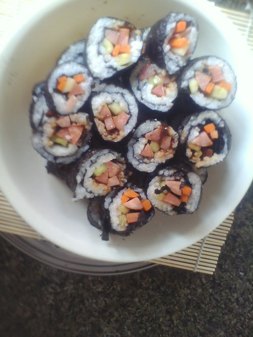 及以下步骤:开始做啦,卷的时候,要往前推,不要把卷帘也卷进去~~~这个是上下都有紫菜的。 再来个单张的。 当当当~~~ok!辣酱依个人喜好添加就ok了。 刀工不怎么样~~~~我的紫菜有点小,所以饭不敢多放。 新鲜出炉。 秀一下我的勺子,可爱吧~~~这是我第一次做,照片也是自己用手机拍的,做的不是太好,请见谅。 当当当~~~ok!辣酱依个人喜好添加就ok了。 刀工不怎么样~~~~我的紫菜有点小,所以饭不敢多放。 新鲜出炉。 秀一下我的勺子,可爱吧~~~这是我第一次做,照片也是自己用手机拍的,做的不是太好,请见谅。