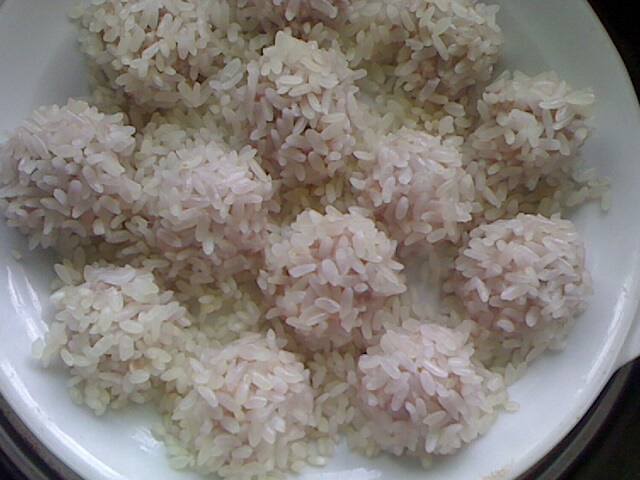 4、把一个个捏好的小肉球往装有糯米的盘子里滚几圈。不过肉球可能变形,所以我是把糯米堆上去的。