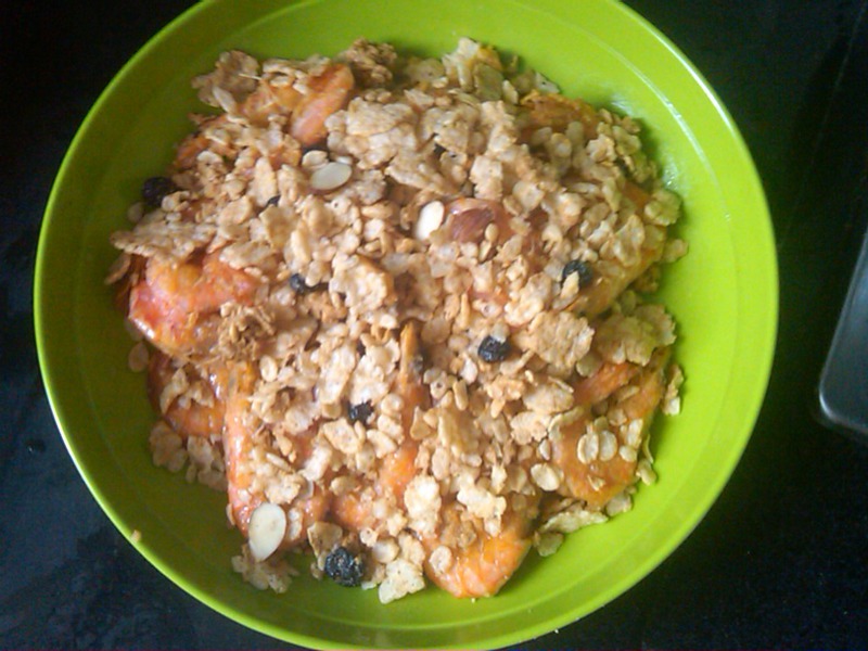 6、在虾上面倒入进口麦片,记得一定要进口的哦。因为进口的奶味更足(马来的更重一些),口感更脆。