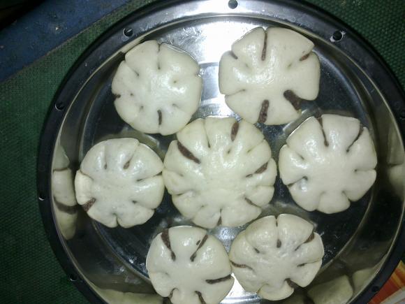 5、同样动作,包好一个就放在抹有油的蒸盘里,包一个放一个,盖上蒸盖发酵15分钟,也就是2次发酵,别着急就直接蒸了o(∩_∩)o哈!,否则出来的就是蜂窝香豆花包了;多余的面团我做成了馒头,还做了其他样式的豆包,花豆包的下层,看不到~\(≧▽≦)/~啦啦啦,我家的是三层蒸锅,三层都布满包子了,嘿嘿。