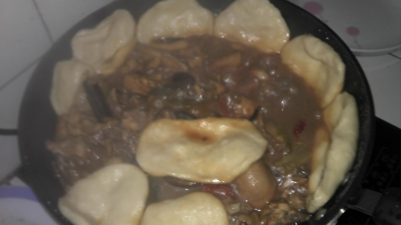 及以下步骤:接着一次放入酱油三汤匙、耗油少许、继续大火翻炒。 把鸡肉加水没过食材,大火煮开,中小火炖着 面团和好备用。 根据个人喜好可以再锅里加一点辅食,我们比较习惯香菇, 把和好的面团捏成小饼顺着锅边放入锅内,淹没过半即可~盖上锅盖十分钟左右饼就可以出锅了,出锅前淋上香油。 喜欢多汤汁的可以把饼翻一下,两面都能吸收到,怕胖的mm可要控制啊~精华都吸附在饼子上了。 面团和好备用。 根据个人喜好可以再锅里加一点辅食,我们比较习惯香菇, 把和好的面团捏成小饼顺着锅边放入锅内,淹没过半即可~盖上锅盖十分钟左右饼就可以出锅了,出锅前淋上香油。 喜欢多汤汁的可以把饼翻一下,两面都能吸收到,怕胖的mm可要控制啊~精华都吸附在饼子上了。