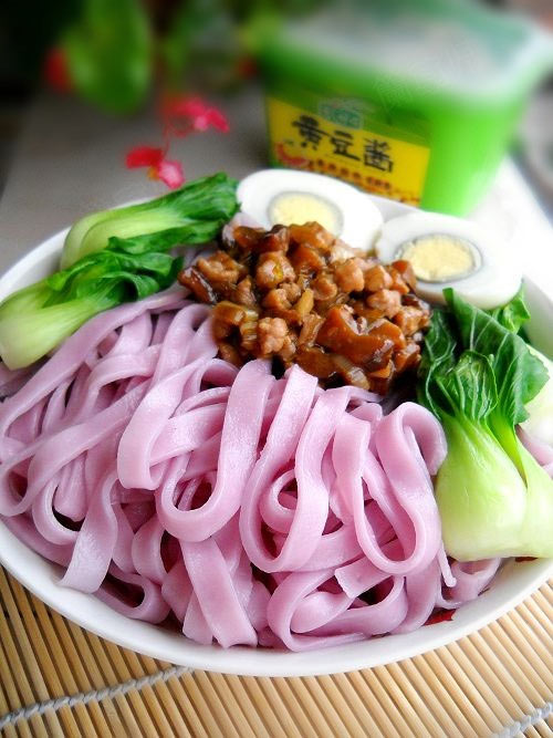 昨天下午看电视剧《师傅》,剧中几个徒弟在师傅家做面条,吃的好香。好久没自己擀面了,还真想吃。都4点半钟了,估计做好了,家里也就没亮光拍照了。加上还是阴天,还得抓紧时间上阳台上拍去。 上次做紫面疙瘩没用完的的甘蓝汁一直在冰箱里冻着,想着拿出来用了,试试能不能做出好看的粉色。面团揉出来就看出了颜色,可这天然色素遇热就会发生变化,不知结果会如何。面条煮好看着漂亮的粉色,好开心··· 用的欣和黄豆酱,鲜咸中略带点甜味。加了蒜瓣、大葱、香菇、瘦肉,做出来的炸酱味道真是不错,难怪我家那小子这么喜欢这个酱。我都不好意思说,拌好的面条,硬是让我一个人给吃了,撑的我哟。我可是做的两人份,真吓人······