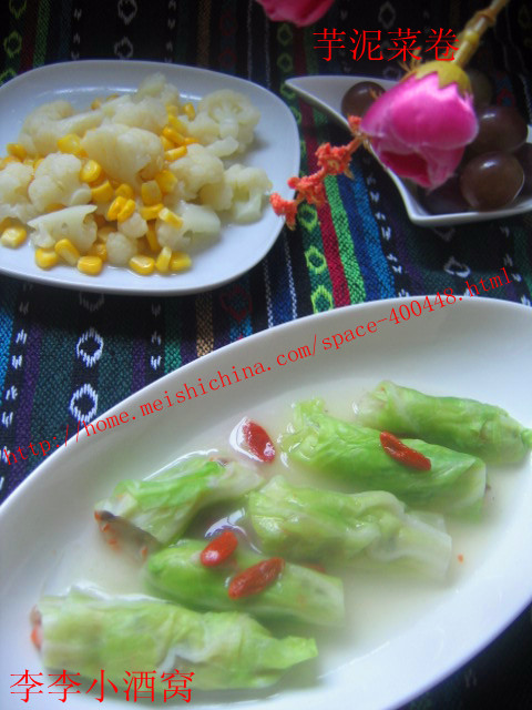 及以下步骤:胡萝卜煮熟切粒,与香菇一起拌入芋泥中。 圆白菜叶用开水烫软,去除硬根,用冷水冲一下。 每片包入适量芋泥,卷成筒状。 入锅蒸5分钟左右。 锅置火上,加盐、胡椒粉、白糖、水烧开用水淀粉勾芡,放入菜卷烧入味,至汤粘稠时撒上枸杞子。 出锅装盘。 每片包入适量芋泥,卷成筒状。 入锅蒸5分钟左右。 锅置火上,加盐、胡椒粉、白糖、水烧开用水淀粉勾芡,放入菜卷烧入味,至汤粘稠时撒上枸杞子。 出锅装盘。