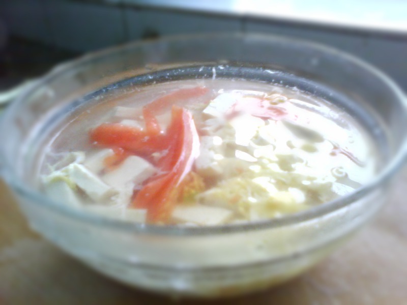 及以下步骤:水开后,在水开的地方,倒入蛋液。 蛋花浮出水面,就好了,最后放一点点盐,就可以装碗开喝了。 将番茄和豆腐洗净。 将豆腐切成一厘米左右的条状或者块状。 将番茄切成条状。 煮一锅开水(可根据家里成员一人一碗水来量) 将切好的豆腐和番茄倒入水中。 在等待水开时,将一个鸡蛋搅打均匀。 水开后,在水开的地方,倒入蛋液。 蛋花浮出水面,就好了,最后放一点点盐,就可以装碗开喝了。