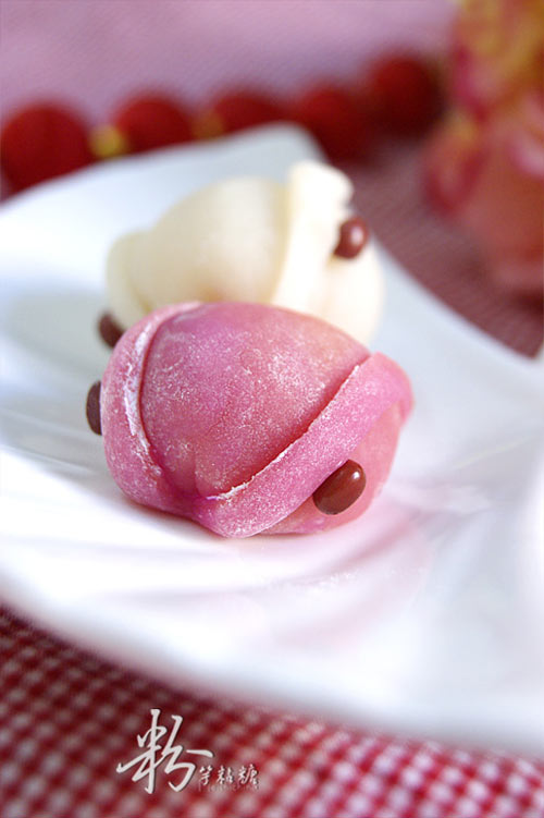 及以下步骤:这时就可以看到细腻的红豆沙(白芸豆要先去皮,其它的方法一样)。 锅里倒入色拉油,把红豆沙倒入锅里翻炒。 然后倒入一汤匙红糖开小火继续翻炒,红糖分三次加入豆沙里翻炒至豆沙水分挥发完。 倒入2汤匙糖桂花,翻炒均匀即可。 炒好的豆沙晾凉后盛在密封的容器里,放进冰箱冷藏。 【冰皮月饼皮的制作方法】:准备好原料。 糕粉的制作:将适量的澄粉放到炒锅里小火炒出香味。 糕粉装入碟中,红肉火龙果榨出汁备用。 牛奶加入糖搅拌均匀,小火加热至糖溶化,牛奶将要沸腾时关。 将未切断的部分沾水,沾到月饼毛坯底部,然后将两条离开少许距离,沾点水沾到月饼毛坯表面,在两边各沾点水粘一粒豆子当做眼睛。