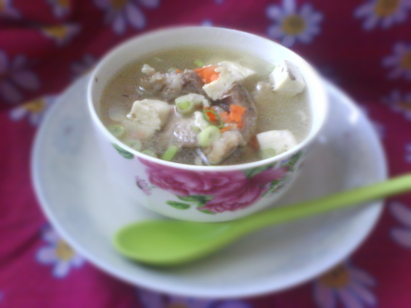及以下步骤:盛汤时,在碗里加上葱花和胡萝卜粒还有盐,汤就好了 将买来已经切好的猪骨洗净。 放在电饭锅中,一次性的加满一大锅的水。 将买来已经切好的猪骨洗净。 放在电饭锅中,一次性的加满一大锅的水。 开始用电饭锅加热,煮三个小时。 加入豆腐再煮十分钟。 胡萝卜切成小粒。 将葱切成葱花。 盛汤时,在碗里加上葱花和胡萝卜粒还有盐,汤就好了