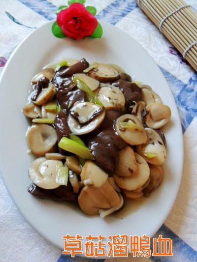 及以下步骤:鸭血冲洗干净切片,在开水中汆一下,捞出沥净水分;草菇切成片;大葱切斜段; 主料是草菇和鸭血; 鸭血冲洗干净切片,在开水中汆一下,捞出沥净水分;草菇切成片;大葱切斜段; 主料是草菇和鸭血; 鸭血冲洗干净切片,在开水中汆一下,捞出沥净水分;草菇切成片;大葱切斜段; 主料是草菇和鸭血; 鸭血冲洗干净切片,在开水中汆一下,捞出沥净水分;草菇切成片;大葱切斜段; 炒锅倒油爆香葱段和姜丝,倒入草菇翻炒至软; 随后加入鸭血翻炒2分钟左右; 最后用水淀粉勾薄芡,撒入盐、鸡精炒匀即可。