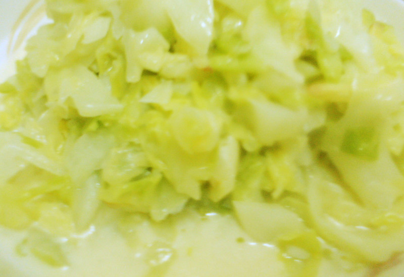 4、放入卷心菜,加入少量的水,翻炒至熟。