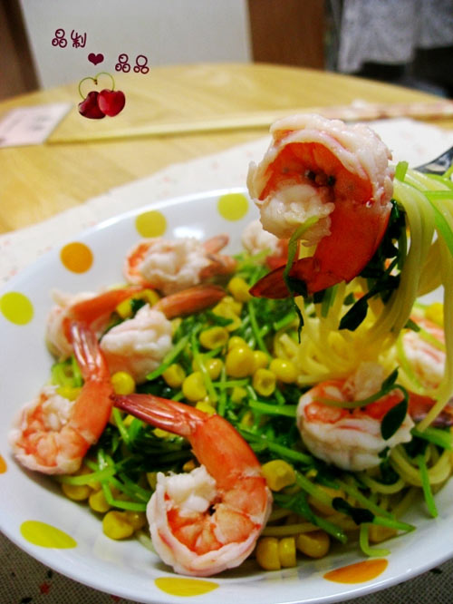 7、淋上豆苗玉米,摆上煮好的虾仁即可。