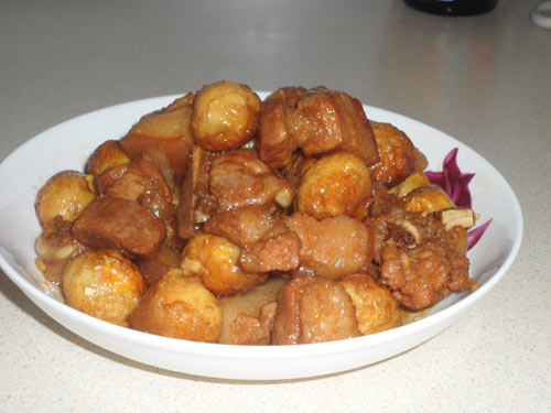 鹌鹑蛋用油稍炸,与肉同烧,以酱油和糖调味,又营养又美味,是成长中儿子的好食物.