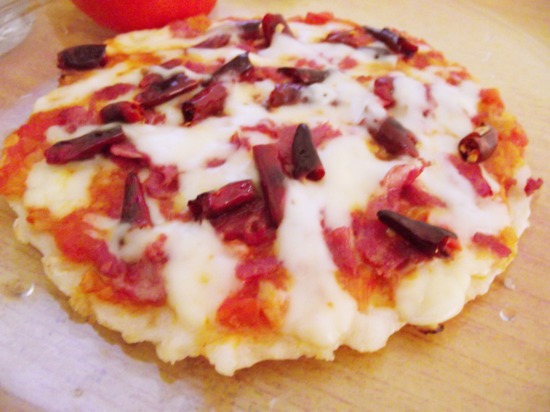 及以下步骤:大概微火煎15分钟左右,查看一下,如果盖子是透明的可以直接观看最好了,待奶酪融化,披萨基本粘合在一起,披萨的香味已经开始四溢了,关火,再闷5分钟。 装盘后,把剩下的半个西红柿点缀在旁边,又配了杯椰奶,开动!超美味呀! (正常的厚底披萨饼底的做法:用面粉+牛奶(清水)+酵母发面,再加点黄油揉面,发一个小时之后把面团擀成中间薄两边厚的饼底,再用叉子叉出细孔。) 半个番茄切碎,卷心菜切碎,蒜瓣切碎,干辣椒切段,奶酪片切丝。 平底锅加一点油,下蒜瓣炒香,加番茄和卷心菜,炒熟后加入番茄酱,多加点,待所有料变成黏糊的状态,加入一点盐和胡椒粉,不需要加很多,大火收下水分,之后盛出待用。 平底锅加一点油,干辣椒段爆香,盛出待用。 平底锅不放油,培根下锅煎到熟,香味扑鼻啊~然后盛出切碎片。 平底锅加一点油,抹平。下面糊,晃动平底锅,让面糊摊平整个锅底,小火慢慢煎,要有耐心,待底面完全煎牢固。翻面后立刻调成微火,迅速开始下料,把番茄蔬菜糊摊上(注意,如果用的是其他的蔬菜做出的糊,量都不要太多,贪多的话面皮会承受不住),撒一层奶酪丝,撒培根碎,撒辣椒段,最后再撒一层奶酪丝,把锅盖盖上。 大概微火煎15分钟左右,查看一下,如果盖子是透明的可以直接观看最好了,待奶酪融化,披萨基本粘合在一起,披萨的香味已经开始四溢了,关火,再闷5分钟。 装盘后,把剩下的半个西红柿点缀在旁边,又配了杯椰奶,开动!超美味呀!