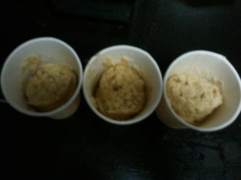 4、把搅拌好的原料倒入纸杯中放微波炉加热4分钟