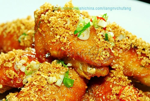 及以下步骤:放适量生粉,将所有配料和鸡翼抓匀,抓匀后味道会融入鸡翼,按摩鸡翼,用手指按压搓揉每只鸡翼,按摩15分钟,这一点很重要(按摩过的鸡翼肉质口感完全不同)。 按摩之后看一下生粉是否放足,如果鸡翼下还有很多酱汁就还需添加生粉,一直到鸡翼表面润滑,但是下面却无流动液体为止,这时候放入冰箱腌渍15分钟。 从冰箱中拿出腌渍好的鸡翼,再次抓揉5分钟。 锅中倒入油,油温到160°,丢一点点面包下去试试温度,周围起小泡就对了。 先放入全部根部,一只一只放入,不要全部一起放。 再放入全部尖部,也是一个个放入(不要全部一次倒入)。 小火炸制8分钟,表面金黄酥脆。 8分钟后,开大火逼油,表皮会更酥脆。 用漏勺从油锅中捞起。 重点来了,最后一步撒风沙蒜粒(风沙就是炸香的蒜粒,蒜粒具体做法可参照我的避风塘炒蟹http://home.meishichina.com/recipe-33983.html)制作完成。