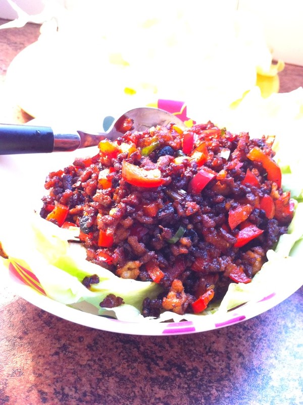 及以下步骤:加适量盐和两小匙老干妈辣椒油。 取一个碗,里面放一片生菜叶,目的是让菜更好看些。将炒好的猪肉碎乘到碗里,同一盘洗净的剩菜一同上桌。吃的时候用生菜为饼包住猪肉碎吃。 肉馅化冻后与老抽,姜末略腌5分钟,时间紧的话跳过也行。 取一平底锅多加点油,放入豆豉,掰碎的干辣椒爆香。至油8成热时加入葱花,花生炒香。 放入腌好的肉馅炒白。 加适量的酱油。 放入彩椒碎。我这里只用了红椒,如果有其他颜色的彩椒放一起会更好看。 炒至彩椒8成熟后,放入甜面酱或者豆瓣酱,此时开小火,炒至整个菜没什么汤汁为止。 加适量盐和两小匙老干妈辣椒油。 取一个碗,里面放一片生菜叶,目的是让菜更好看些。将炒好的猪肉碎乘到碗里,同一盘洗净的剩菜一同上桌。吃的时候用生菜为饼包住猪肉碎吃。