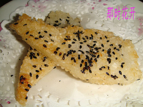 及以下步骤:用吸油纸吸去多余的油,即可享用。 提前一晚将糥米洗净泡好。 炒香的黑芝麻。 提前一晚将糥米洗净泡好。 炒香的黑芝麻。 煮好的糯米饭加少许的白糖拌匀。 把糯米饭平铺在浅口方盘里压实厚度约2cm的长方形,放入冰箱冷冻。 冷冻30分钟左右,拿出切成块状。 放入油锅里煎炸至两面金黄。 用吸油纸吸去多余的油,即可享用。