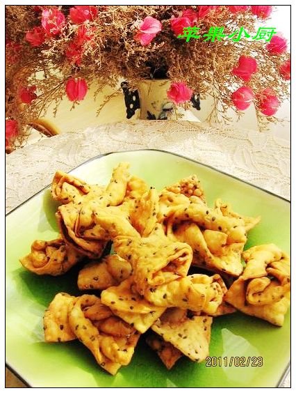 网上朋友们都叫它排叉,在俺们这,叫它七巧果。为什么这样叫呢?因为,这种形状的炸果,是专门在农历七月初七这天食用的。七月初七,是牛郎与织女相会的日子,所以,这炸果,我们这叫七巧果。还有叫它翻背果的,大概是因为它在制做过程中,需要穿叉内翻一下,所以因此而取意而得名吧!