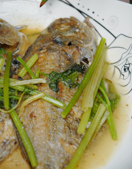 及以下步骤:煮至汤汁发白略快收干后出锅。 鱼洗净,去腮去肚,洗净鱼肚的黑膜,鱼身两面用盐腌一下。 炒锅下油烧热,油不用多,煎过鱼的油也不能炒菜,别浪费,够煎两条鱼就行。 鱼洗净,去腮去肚,洗净鱼肚的黑膜,鱼身两面用盐腌一下。 炒锅下油烧热,油不用多,煎过鱼的油也不能炒菜,别浪费,够煎两条鱼就行。 把腌好的鱼略煎。 煎至两面金黄。 底油爆香芹菜。 倒入小半碗水。 煮至汤汁发白略快收干后出锅。