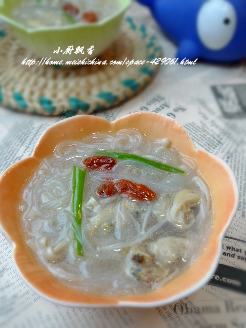 及以下步骤:倒入粉丝。 倒入盐、味精、胡椒粉。煮透后撒入葱丝、枸杞子点缀。 美味的蛤蜊金针粉丝汤做好了。 粉丝用温水泡开。 锅内放油,倒入葱丝和蛤蜊肉。倒入绍酒翻炒均匀。 放入少许清汤。 倒入金针菇。 倒入粉丝。 倒入盐、味精、胡椒粉。煮透后撒入葱丝、枸杞子点缀。 美味的蛤蜊金针粉丝汤做好了。