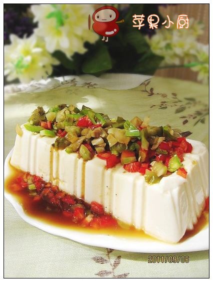 及以下步骤:准备内脂豆腐、榨菜、青红椒。 将青红椒、榨菜切末备用。 准备内脂豆腐、榨菜、青红椒。 将青红椒、榨菜切末备用。 准备内脂豆腐、榨菜、青红椒。 将青红椒、榨菜切末备用。 内脂豆腐完整的从盒内倒扣出,将菜末放在上面。 将胡椒粉、醋、味极鲜、芝麻油、花椒油调成汁。 浇在豆腐与菜末上。 食用即可。