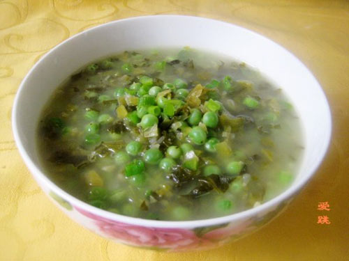 4、放适量清水煮至豌豆熟,放下咸菜。
