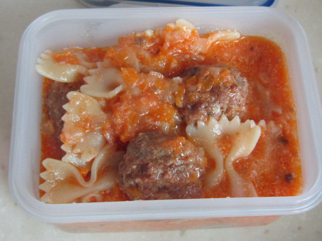 及以下步骤:准备红酱的原料。 洋葱切丁、胡萝卜切末、番茄去皮料理机打成泥。 热锅放黄油融化。 先放胡萝卜炒到油变红色。 加入洋葱丁炒到洋葱变色出香味。 加入番茄泥。 加入干牛至碎、干罗勒碎、盐、糖。 放入意式肉丸。 中小火慢煮半小时。 哈哈!被你们看到了,这是我带去公司的饭盒。