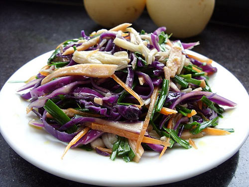 1,盐在放韭菜之前加,韭菜比较容易吸咸味,先加,紫甘蓝和胡萝卜更入味。