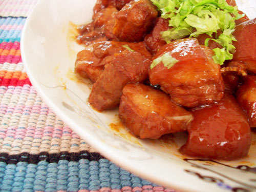 苏东坡曾道:无竹令人俗,无肉使人瘦,不俗又不瘦,竹笋焖猪肉。可见红烧肉最好的搭配是笋干无疑。 红烧肉有很多版本,让人眼花缭乱。作为一个吃货,凭着四处借鉴的经验,循着自己的口味炮制出这道红烧肉,其实每次的做法都根据心情略有不同,但是大原则始终是:软糯滑烂,浓油赤酱,稍偏甜口。喜欢甜不仅因为甜能带出肉的鲜香,更因为我祖籍天津,从小吃惯了奶奶做的菜,长大以后也偏爱甜口的肉菜。 一直觉得,红烧肉关键的在一个煨字。用砂锅小火煨出来的红烧肉,原汁原味浓香扑鼻,是最最下饭的。最近刚刚搬家,天然气还没有接上,便只能先用电磁炉对付着,索性试试烧一次不用火的红烧肉,成果竟也还说得过去。