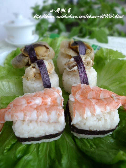 手握寿司是寿司的最代表作品。制作时,把米饭拌上寿司醋,捏成大小合适的饭团,把新鲜的海胆黄,鲍鱼,牡丹虾,扇贝,鲑鱼籽,鳕鱼鱼白,金枪鱼,三文鱼等海鲜切成片,放在雪白香糯的饭团上,一揉一捏之后再抹上鲜绿的芥末酱,最后放到精致的瓷盘中……如此的色彩组合,是真正的秀色可餐。 吃寿司,讲究的是食用的完整,就是整块寿司要一口吃下,唯其如此,才能真正的品味出寿司的美味,寿司的饭香与海鲜的香味才能完全相融,将齿颊间填得满满,不留一丝缝隙, 那浓香的滋味无处可逃,在口中久久徘徊,一波三折。 我今天制作了改良版的手握寿司,应该比较适合中国人的口味,咱可不敢像日本人那样敢吃什么生鱼生虾的。 海鲜都是内地的,哥哥到外地出差,从海边买来一些新鲜的海鲜坐飞机空运回来,被我立马速冻。呵呵,还好才十多天时间。虽是速冻,也还算新鲜吧。今天做的海鲜寿司,可是要蘸芥末的呀,要不然,还是腥腥(鲜)的呢。