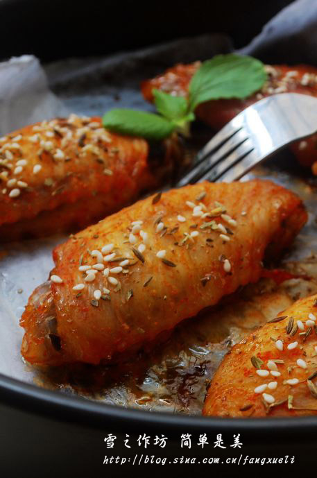 烤箱200度,烤20-25分钟左右,我的烤箱是带有旋风的,所以中途不需要翻面,如果不带旋风功能的烤箱,可以在烤制10分钟之后翻面一次,除了用烤盘,也可以直接放在烤网上,不过需要有接渣盘,再铺上锡纸,不然要清洗的时候会非常的难洗,如果直接用微波炉的朋友,可以用高火烤制,什香草没有可以不放,但我感觉烤肉类还是要加上孜然味道会更好,当然,芝麻最好也不要少哦