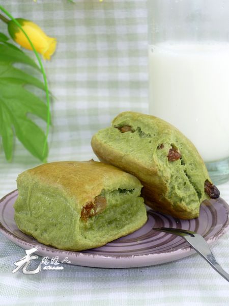蛋液(适量) / 细砂糖(15g) / 葡萄干(适量) / 抹茶粉(8g) / 天然酵种(280g)