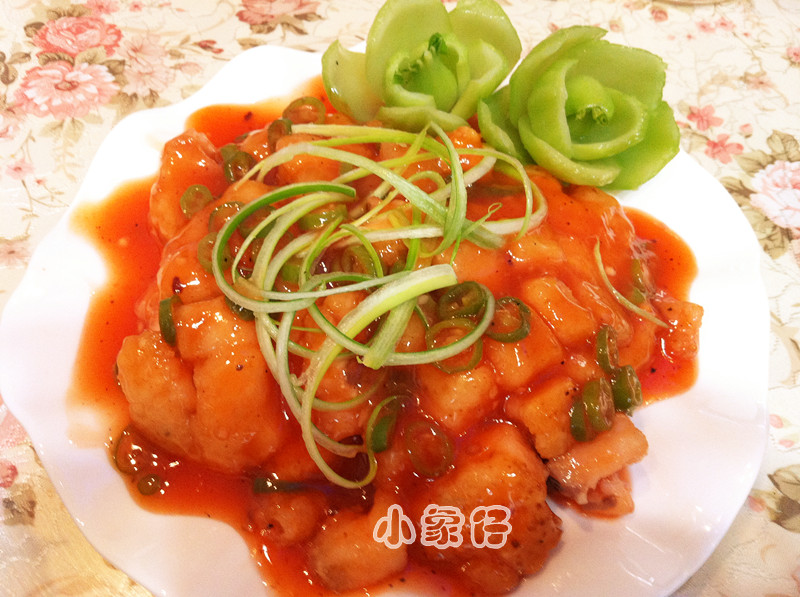 及以下步骤:淀粉拍均匀,准备入锅炸。 入锅中火炸至鱼肉金黄。 捞出控油摆入盘中。 锅里留少许油,加入青椒翻炒。 倒入事先准备好的番茄汁,不停搅拌。 最后浇到炸好的鱼上面即可。 撒上少许葱丝。(葱丝的切法:用牙签挑开,即可,嘻嘻) 酸甜酥脆,可美味了,嘿嘿。 撒上少许葱丝。(葱丝的切法:用牙签挑开,即可,嘻嘻) 酸甜酥脆,可美味了,嘿嘿。