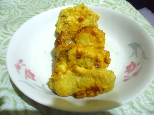 7、油七成热下锅炸裹满蛋糊的带鱼,金黄色捞出。
